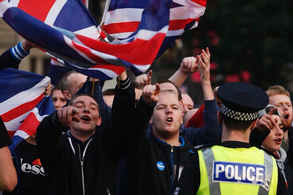 The joy and exuberance witnessed in George Square in the days before the vote had been usurped by a violent British nationalism. This was no celebration of unity, rather it was a nasty, hate filled exhibition of triumphalism and intolerance dressed in red, white and blue, more akin to the football violence of the eighties than the conclusion of a referendum vote. Nazi salutes, taunts and assaults were the order of the day for a gathering organised on Facebook, advertised by Britain First and somehow completely missed by the security services who, we were told, will keep us safe if we stay together.